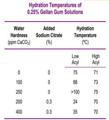 • Concentration of ions in solution will affect the hydration temp. such as calcium , Sodium• Low acyl gellan gum requires a temperature of 75 ℃(1670F) to fully hydrate the gum.• High acyl gellan gum hydrates between 70℃ and 80 ℃(1580F and 1760F) even in relatively high ion concentrations